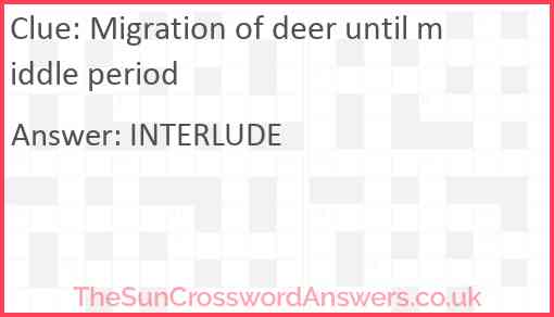 Migration of deer until middle period is a crossword clue for which we have 1 possible answer and we have spotted 1 times in our database. This crossword clue was last seen on 02 January 2025 in The Sun Cryptic Crossword puzzle!