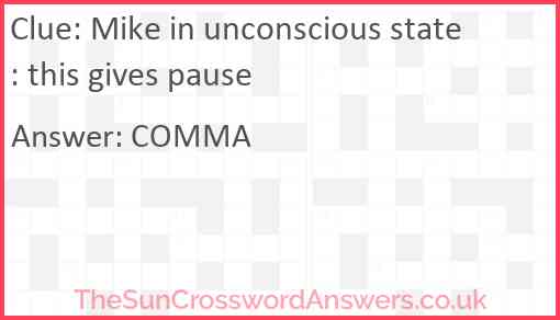 Mike in unconscious state: this gives pause is a crossword clue for which we have 1 possible answer and we have spotted 3 times in our database. This crossword clue was last seen on 20 March 2025 in The Sun Cryptic Crossword puzzle!
