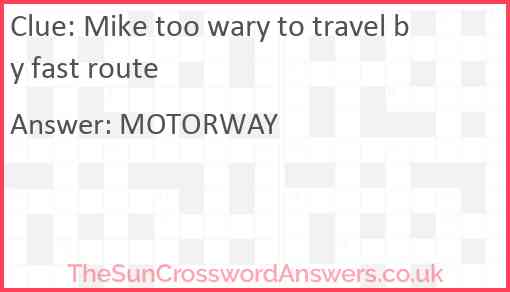 Mike too wary to travel by fast route is a crossword clue for which we have 1 possible answer and we have spotted 1 times in our database. This crossword clue was last seen on 10 September 2022 in The Sun Cryptic Crossword puzzle!