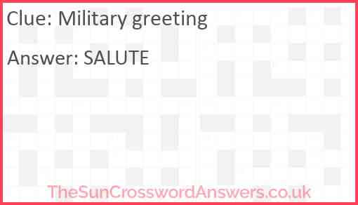 Military greeting is a crossword clue for which we have 1 possible answer and we have spotted 2 times in our database. This crossword clue was last seen on 18 December 2024 in The Sun Coffee Time Crossword puzzle!