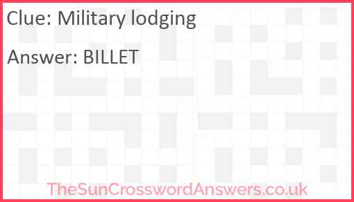 Military lodging is a crossword clue for which we have 1 possible answer and we have spotted 5 times in our database. This crossword clue was last seen on 24 May 2025 in The Sun Coffee Time Crossword puzzle!