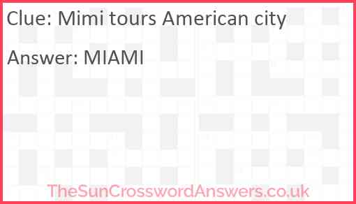 Mimi tours American city is a crossword clue for which we have 1 possible answer and we have spotted 2 times in our database. This crossword clue was last seen on 02 July 2024 in The Sun Cryptic Crossword puzzle!
