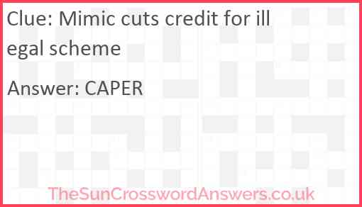 Mimic cuts credit for illegal scheme is a crossword clue for which we have 1 possible answer and we have spotted 2 times in our database. This crossword clue was last seen on 24 May 2022 in The Sun Cryptic Crossword puzzle!