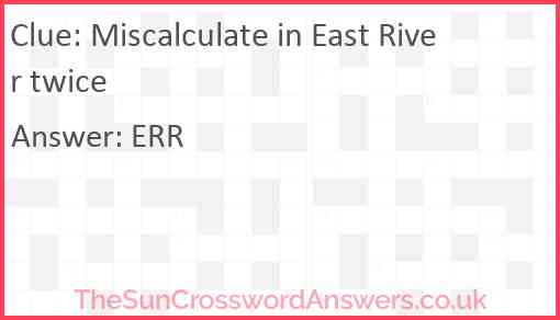 Miscalculate in East River twice is a crossword clue for which we have 1 possible answer and we have spotted 4 times in our database. This crossword clue was last seen on 11 April 2025 in The Sun Cryptic Crossword puzzle!