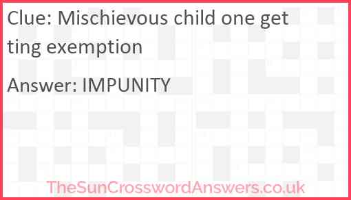Mischievous child one getting exemption is a crossword clue for which we have 1 possible answer and we have spotted 2 times in our database. This crossword clue was last seen on 10 June 2023 in The Sun Cryptic Crossword puzzle!