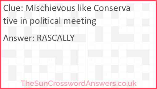 Mischievous like Conservative in political meeting is a crossword clue for which we have 1 possible answer and we have spotted 1 times in our database. This crossword clue was last seen on 03 August 2024 in The Sun Cryptic Crossword puzzle!