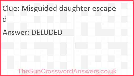 Misguided daughter escaped is a crossword clue for which we have 1 possible answer and we have spotted 2 times in our database. This crossword clue was last seen on 19 December 2024 in The Sun Cryptic Crossword puzzle!