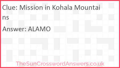 Mission in Kohala Mountains is a crossword clue for which we have 1 possible answer and we have spotted 1 times in our database. This crossword clue was last seen on 21 August 2021 in The Sun Cryptic Crossword puzzle!