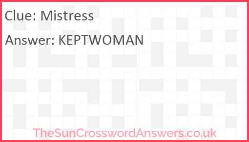 Mistress is a crossword clue for which we have 2 possible answer and we have spotted 3 times in our database. This crossword clue was last seen on 27 August 2023 in The Sun Coffee Time Crossword puzzle!
