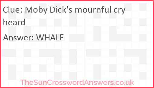 Moby Dick's mournful cry heard is a crossword clue for which we have 1 possible answer and we have spotted 1 times in our database. This crossword clue was last seen on 17 November 2024 in The Sun Cryptic Crossword puzzle!