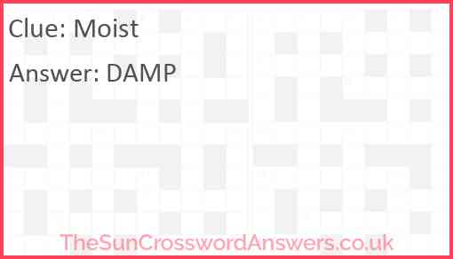 Moist is a crossword clue for which we have 1 possible answer and we have spotted 2 times in our database. This crossword clue was last seen on 22 May 2021 in The Sun Coffee Time Crossword puzzle!