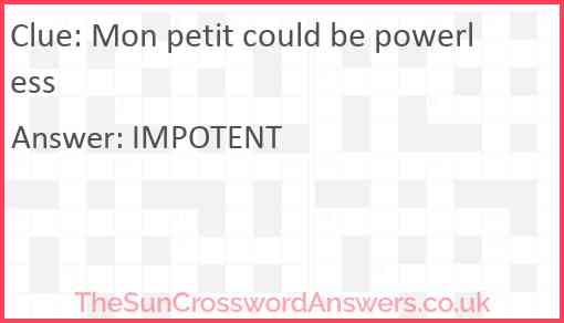 Mon petit could be powerless is a crossword clue for which we have 1 possible answer and we have spotted 3 times in our database. This crossword clue was last seen on 20 September 2023 in The Sun Cryptic Crossword puzzle!