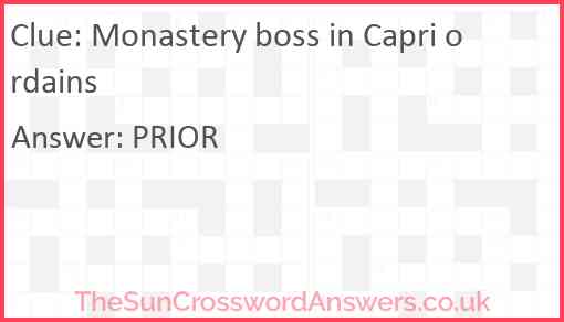 Monastery boss in Capri ordains is a crossword clue for which we have 1 possible answer and we have spotted 2 times in our database. This crossword clue was last seen on 23 December 2024 in The Sun Cryptic Crossword puzzle!