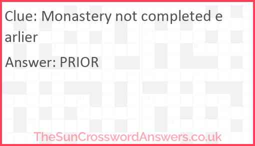 Monastery not completed earlier is a crossword clue for which we have 1 possible answer and we have spotted 2 times in our database. This crossword clue was last seen on 10 November 2022 in The Sun Cryptic Crossword puzzle!