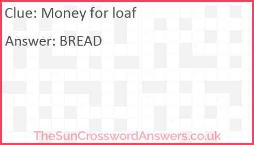 Money for loaf is a crossword clue for which we have 1 possible answer and we have spotted 1 times in our database. This crossword clue was last seen on 01 May 2022 in The Sun Cryptic Crossword puzzle!