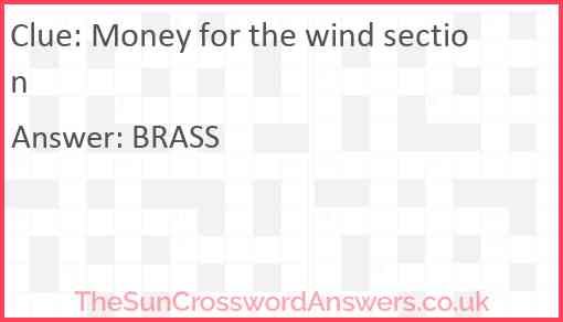 Money for the wind section is a crossword clue for which we have 1 possible answer and we have spotted 1 times in our database. This crossword clue was last seen on 21 November 2024 in The Sun Cryptic Crossword puzzle!