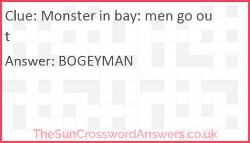 Monster in bay: men go out is a crossword clue for which we have 1 possible answer and we have spotted 2 times in our database. This crossword clue was last seen on 04 August 2024 in The Sun Cryptic Crossword puzzle!