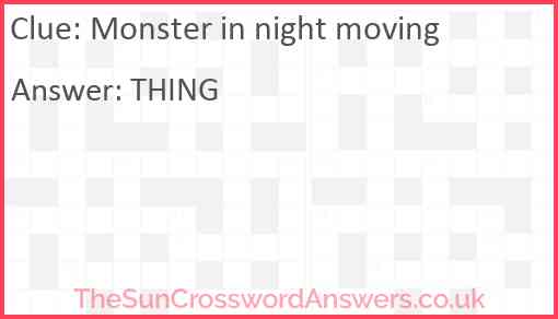 Monster in night moving is a crossword clue for which we have 1 possible answer and we have spotted 2 times in our database. This crossword clue was last seen on 10 June 2023 in The Sun Cryptic Crossword puzzle!