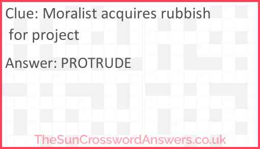 Moralist acquires rubbish for project is a crossword clue for which we have 1 possible answer and we have spotted 1 times in our database. This crossword clue was last seen on 19 October 2018 in The Sun Cryptic Crossword puzzle!