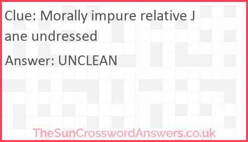 Morally impure relative Jane undressed is a crossword clue for which we have 1 possible answer and we have spotted 1 times in our database. This crossword clue was last seen on 18 January 2025 in The Sun Cryptic Crossword puzzle!
