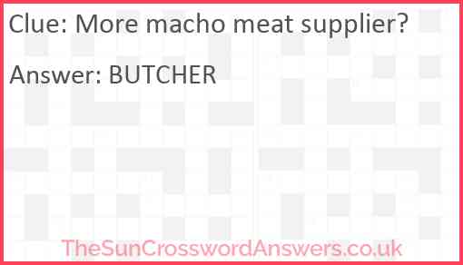 More macho meat supplier? is a crossword clue for which we have 1 possible answer and we have spotted 4 times in our database. This crossword clue was last seen on 14 July 2024 in The Sun Cryptic Crossword puzzle!