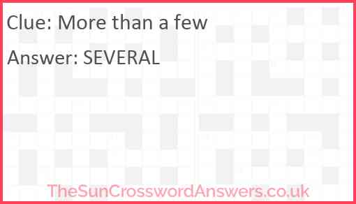 More than a few is a crossword clue for which we have 2 possible answer and we have spotted 5 times in our database. This crossword clue was last seen on 05 January 2023 in The Sun Coffee Time Crossword puzzle!