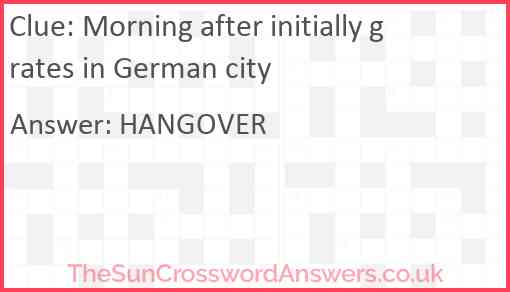 Morning after initially grates in German city is a crossword clue for which we have 1 possible answer and we have spotted 3 times in our database. This crossword clue was last seen on 11 November 2022 in The Sun Cryptic Crossword puzzle!