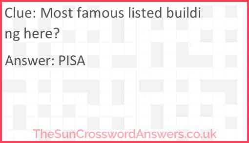 Most famous listed building here? is a crossword clue for which we have 1 possible answer and we have spotted 3 times in our database. This crossword clue was last seen on 26 September 2023 in The Sun Cryptic Crossword puzzle!