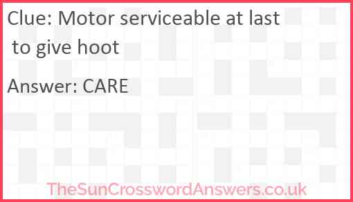 Motor serviceable at last to give hoot is a crossword clue for which we have 1 possible answer and we have spotted 3 times in our database. This crossword clue was last seen on 05 March 2023 in The Sun Cryptic Crossword puzzle!