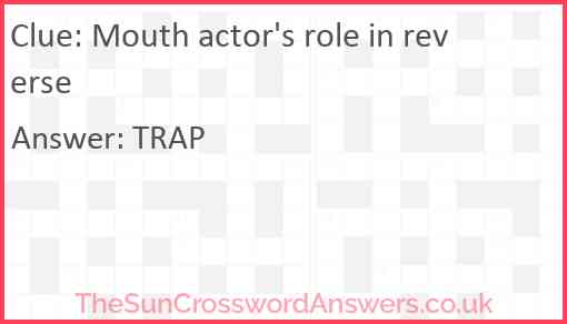 Mouth actor's role in reverse is a crossword clue for which we have 1 possible answer and we have spotted 5 times in our database. This crossword clue was last seen on 20 June 2025 in The Sun Cryptic Crossword puzzle!