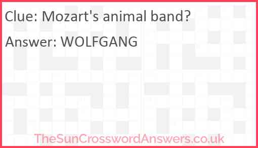 Mozart's animal band? is a crossword clue for which we have 1 possible answer and we have spotted 1 times in our database. This crossword clue was last seen on 22 May 2024 in The Sun Cryptic Crossword puzzle!