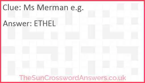 Ms Merman e.g. is a crossword clue for which we have 1 possible answer and we have spotted 2 times in our database. This crossword clue was last seen on 25 March 2024 in The Sun Coffee Time Crossword puzzle!