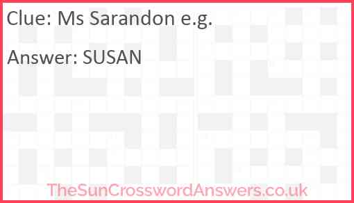 Ms Sarandon e.g. is a crossword clue for which we have 1 possible answer and we have spotted 3 times in our database. This crossword clue was last seen on 26 October 2024 in The Sun Coffee Time Crossword puzzle!