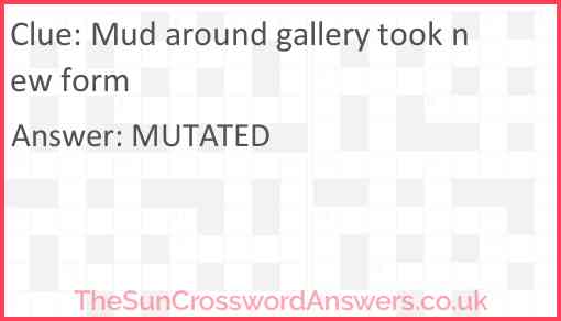 Mud around gallery took new form is a crossword clue for which we have 1 possible answer and we have spotted 3 times in our database. This crossword clue was last seen on 26 February 2024 in The Sun Cryptic Crossword puzzle!