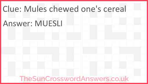Mules chewed one's cereal is a crossword clue for which we have 1 possible answer and we have spotted 2 times in our database. This crossword clue was last seen on 25 March 2022 in The Sun Cryptic Crossword puzzle!