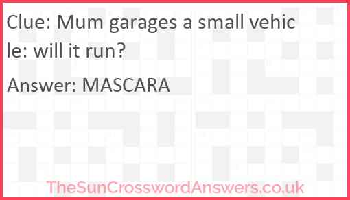 Mum garages a small vehicle: will it run? is a crossword clue for which we have 1 possible answer and we have spotted 1 times in our database. This crossword clue was last seen on 25 August 2024 in The Sun Cryptic Crossword puzzle!