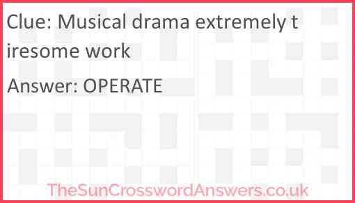 Musical drama extremely tiresome work is a crossword clue for which we have 1 possible answer and we have spotted 2 times in our database. This crossword clue was last seen on 13 April 2024 in The Sun Cryptic Crossword puzzle!