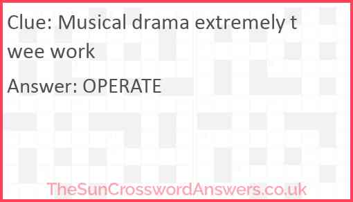 Musical drama extremely twee work is a crossword clue for which we have 1 possible answer and we have spotted 2 times in our database. This crossword clue was last seen on 03 September 2023 in The Sun Cryptic Crossword puzzle!