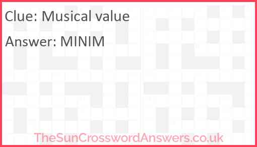 Musical value is a crossword clue for which we have 1 possible answer and we have spotted 4 times in our database. This crossword clue was last seen on 05 May 2023 in The Sun Coffee Time Crossword puzzle!
