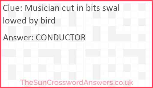 Musician cut in bits swallowed by bird is a crossword clue for which we have 1 possible answer and we have spotted 2 times in our database. This crossword clue was last seen on 09 November 2022 in The Sun Cryptic Crossword puzzle!