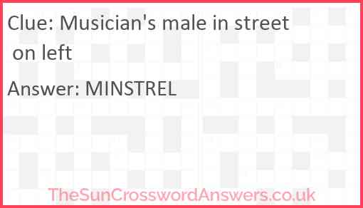 Musician's male in street on left is a crossword clue for which we have 1 possible answer and we have spotted 2 times in our database. This crossword clue was last seen on 20 September 2024 in The Sun Cryptic Crossword puzzle!
