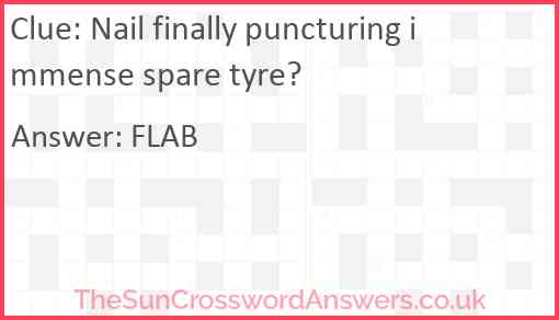 Nail finally puncturing immense spare tyre? is a crossword clue for which we have 1 possible answer and we have spotted 1 times in our database. This crossword clue was last seen on 30 December 2023 in The Sun Cryptic Crossword puzzle!