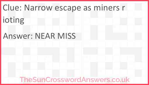 Narrow escape as miners rioting is a crossword clue for which we have 2 possible answer and we have spotted 3 times in our database. This crossword clue was last seen on 23 April 2024 in The Sun Cryptic Crossword puzzle!
