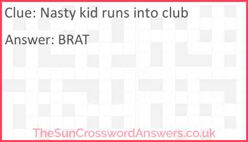 Nasty kid runs into club is a crossword clue for which we have 1 possible answer and we have spotted 4 times in our database. This crossword clue was last seen on 15 March 2024 in The Sun Cryptic Crossword puzzle!