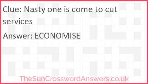 Nasty one is come to cut services is a crossword clue for which we have 1 possible answer and we have spotted 2 times in our database. This crossword clue was last seen on 29 July 2022 in The Sun Cryptic Crossword puzzle!