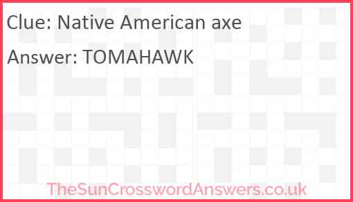 Native American axe is a crossword clue for which we have 1 possible answer and we have spotted 4 times in our database. This crossword clue was last seen on 31 May 2025 in The Sun Coffee Time Crossword puzzle!