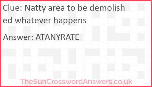Natty area to be demolished whatever happens is a crossword clue for which we have 1 possible answer and we have spotted 1 times in our database. This crossword clue was last seen on 08 September 2024 in The Sun Cryptic Crossword puzzle!