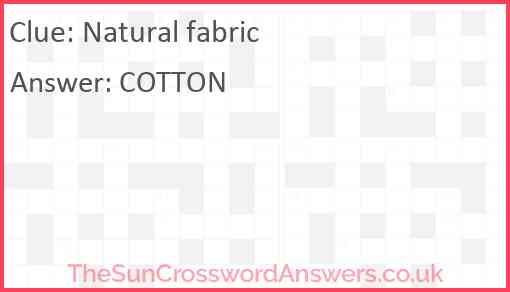 Natural fabric is a crossword clue for which we have 1 possible answer and we have spotted 5 times in our database. This crossword clue was last seen on 14 December 2022 in The Sun Coffee Time Crossword puzzle!