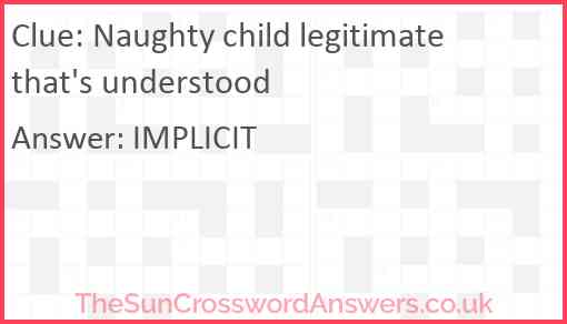 Naughty child legitimate that's understood is a crossword clue for which we have 1 possible answer and we have spotted 2 times in our database. This crossword clue was last seen on 12 March 2023 in The Sun Cryptic Crossword puzzle!