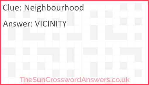 Neighbourhood is a crossword clue for which we have 2 possible answer and we have spotted 12 times in our database. This crossword clue was last seen on 31 March 2024 in The Sun Coffee Time Crossword puzzle!
